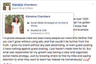 This is helpful because when you’re interacting in groups or other pages, people can hover over your name and determine whether to check out your page.